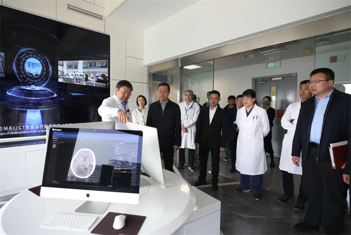 4月8日下午,王少峰同志带队走访首都医科大学附属北京天坛医院 实地参观天坛神经影像研究中心、医院科技创新成果转化展示区和神经系统疾病人工智能研究中心,仔细了解技术研发过程和成果转化落地情况,并围绕进一步深化合作座谈交流。
