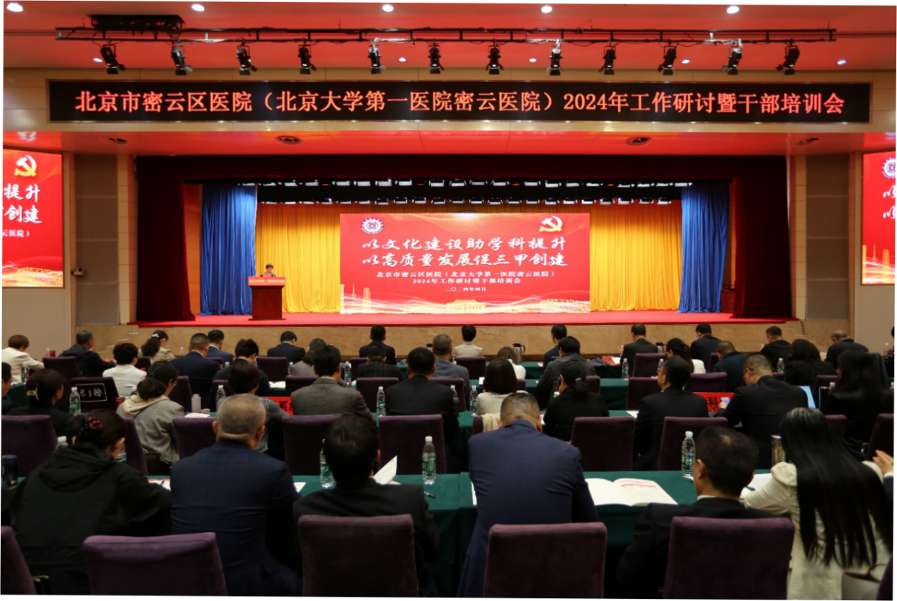 4月13日-14日,北京大学第一医院密云医院开展“以文化建设助学科提升 以高质量发展促三甲创建”为主题的2024年工作研讨暨干部培训会,国家卫生健康委应急司司长郭燕红,市卫生健康委党委书记钟东波出席并讲话,密云区副区长施辉阳作开场致辞。北京大学第一医院党委书记姜辉、院长杨尹默,市卫生健康委办公室主任钱戈戈、医政医管处处长陆珊,密云区卫生健康委党委书记、主任王文平,医保局党组书记、局长李斌,卫生健康委党委成员,委机关科室负责人,密云医院中层以上领导干部共210余人参加会议。