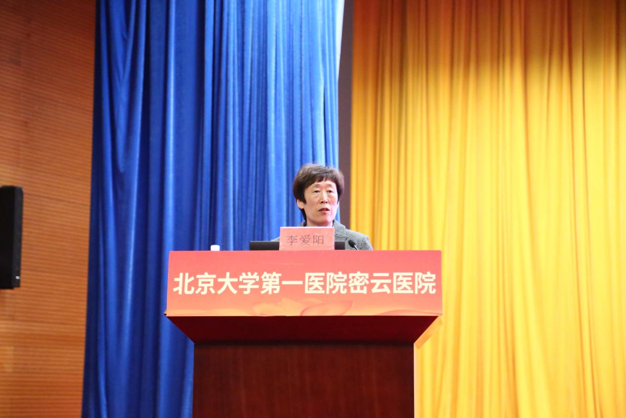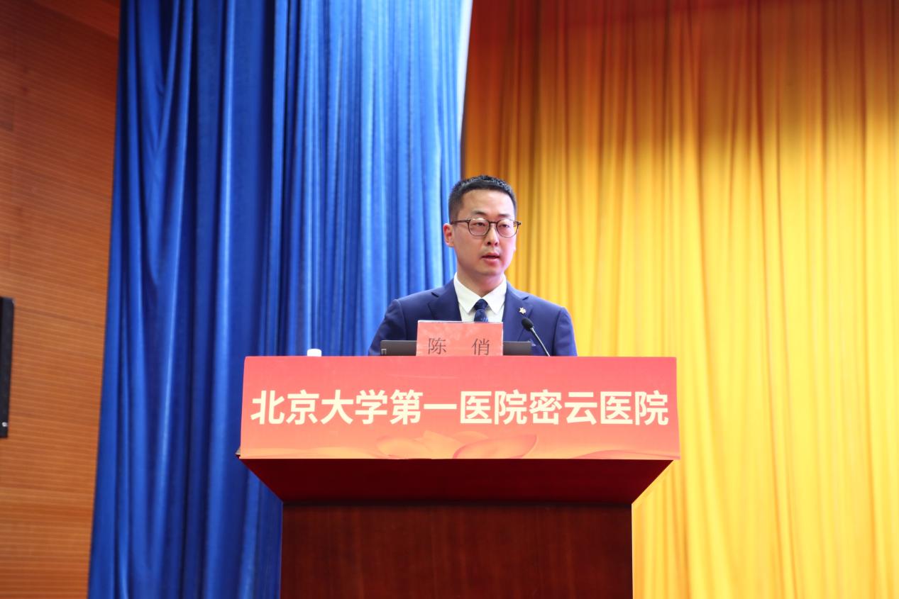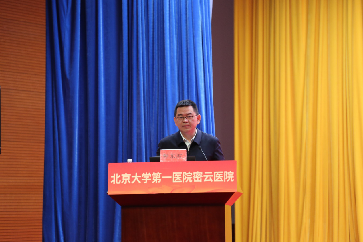 李爱阳书记以《明形势 定方向 抓机遇 聚力量——全力推进医院高质量发展》为题进行报告。报告指出,2023年医院全面落实党委领导下的院长负责制,坚持党管干部原则,加强干部的教育培训和考核,并通过开展主题教育、创建无投诉岗、我为群众办实事、发展年作风年等多项党建活动,提高了政治站位,带领全院职工立足岗位争当先锋。随着两院融合的不断深入,密云医院重点学科建设工作稳步推进,五大中心建设也取得了新的突破,医疗服务得到全面提升,百姓就医获得感明显增强。聚焦2024年,在区委区政府、区卫生健康委及北大医院的大力支持下,密云医院的发展迎来了前所未有的机遇与挑战,医院将以创建三级甲等医院、文化建设年为抓手,以国考指标为导向,加强学科建设和运营管理,不断完善相关制度机制,推进人才队伍建设及信息化建设,全面落实强管理、做增量、促发展的举措,将“高质量发展”作为推动医院各项工作的重要引擎,实现同质化管理的目标。