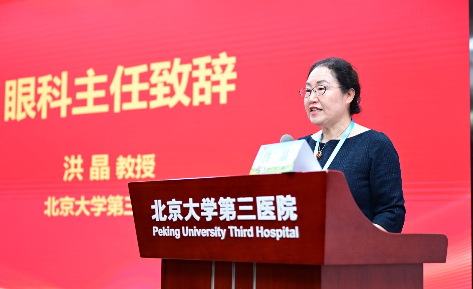 随后,北京大学第三医院眼科主任洪晶发表了热情洋溢的致辞。她介绍了北京大学第三医院眼科在医疗、教学、科研等方面所开展的工作和取得的成绩,表示眼科医联体和研联体以优质医疗及科研资源整合为基础,通过促进各级医疗机构眼科间的紧密合作与深度沟通,实现资源共享、优势互补,有效提升患者的就医体验和医疗服务质量。截至目前,北京大学第三医院眼科医联体已拥有100余家成员单位,研联体意向单位达到33家,这些成员单位汇聚了来自全国各地的眼科精英和专家。未来,眼科医联体和研联体将秉承“共享、共赢、共进”的理念,通过加强交流与合作、整合资源与创新、提升技术与服务,共同推动我国眼科医疗事业的繁荣与发展,为更多患者带来更加优质、高效、便捷的医疗服务。