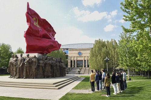 来到中共中央党校综合教学楼前广场,党员们瞻仰大型黄铜组雕《旗帜》。雕塑上部是如火炬般燃烧的鲜红党旗,下部是中国人民人物群像,以鲜活的艺术语言刻画了全国56个民族和工人、农民、知识分子、干部、解放军指战员、新社会阶层等中国特色社会主义建设者,紧密团结在党中央周围,众志成城、坚定豪迈地为实现中华民族伟大复兴中国梦努力奋斗的昂扬精神风貌,展现全党全军全国各族人民对中国特色社会主义的道路自信、理论自信、制度自信、文化自信。干部保健处党支部及宣传中心党支部党员在雕塑前重温入党誓词,坚定终身信仰、砥砺初心使命、常怀为民情怀。