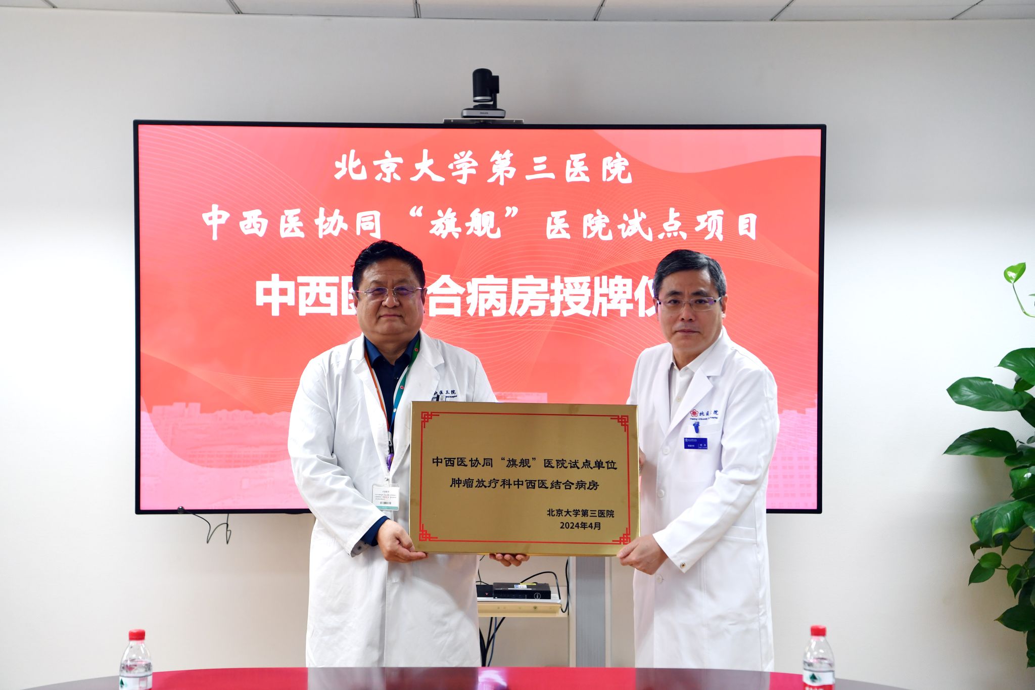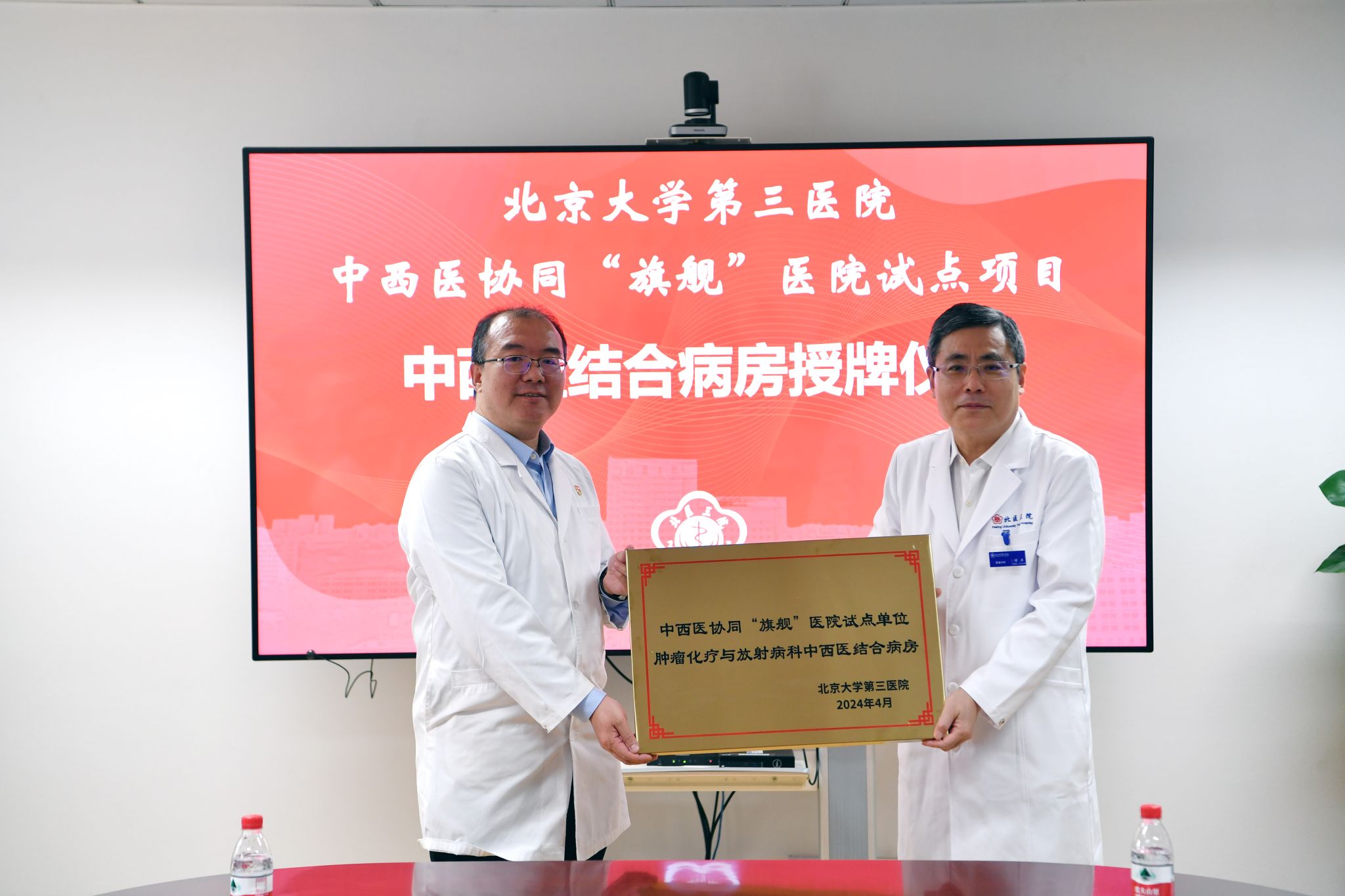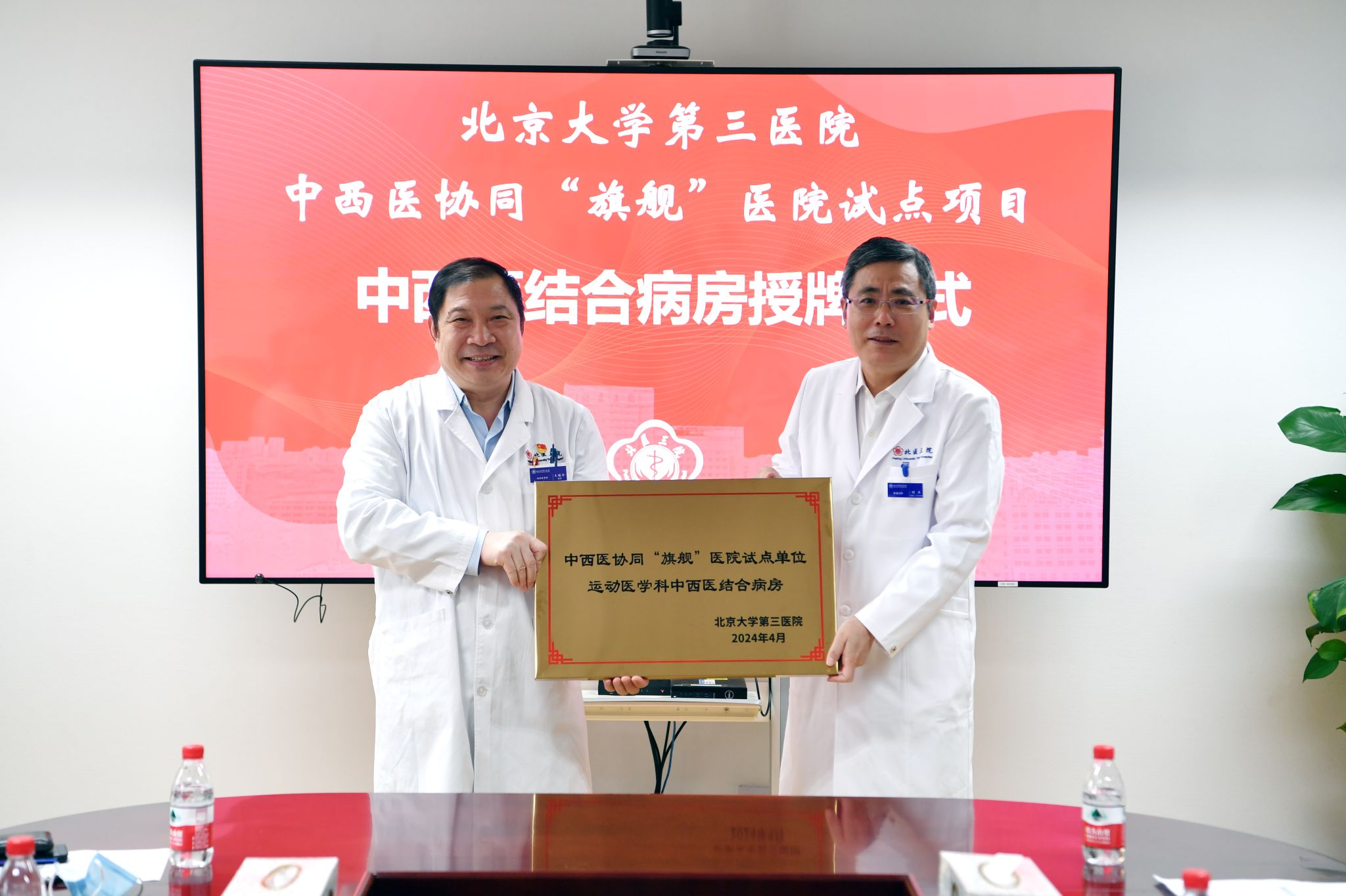 2024年4月25日下午,北京大学第三医院举行中西医结合病房授牌仪式。院长付卫、副院长李蓉,相关临床科室、职能处室负责人出席仪式。中西医结合病房的正式授牌,标志着北京大学第三医院在中西医结合领域迈出了坚实的一步,具有里程碑意义。授牌仪式由医务处处长胥雪冬主持。