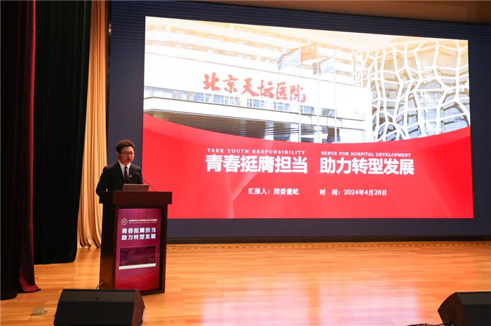 2024年4月28日,北京天坛医院五四总结表彰大会在忠诚楼报告厅举行,大会主题为“青春挺膺担当 助力转型发展”。北京天坛医院党委书记岳小林,党委常委、纪委书记任静,党委常委、工会主席徐燕玲,党委常委、总会计师刘菊梅出席大会,部分中层干部、受表彰的团干部与团员青年、志愿者代表、第六批“苗圃工程”培养人员、学生团员代表等约100人参加大会。大会由团委副书记曹磊主持。