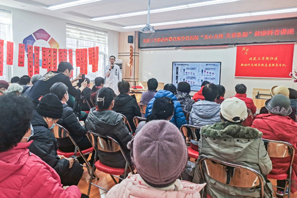 院前管理侧重健康科普知识宣讲。医院医务社工与医护人员联手,定期在医院或深入社区,开展女性关爱乳房、防治乳腺疾病的主题健康讲座,帮助广大女性预防相关疾病。