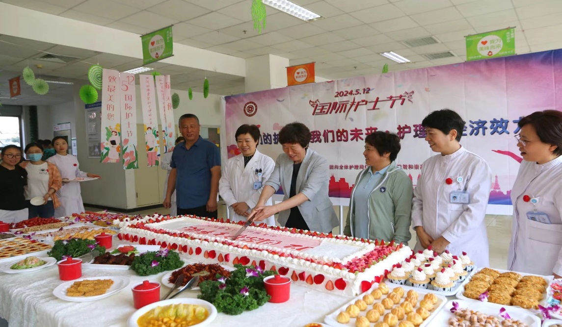 区医院为关爱护士队伍成长,激励护理团队积极向上,5月上旬,护理部已深入临床一线,开展护理工作写照视频拍摄活动,用镜头捕捉点滴感人、温馨的瞬间,用精彩真实的画面展示和谐的护患关系,凸显岗位奉献、积极向上、爱岗敬业的职业风采。5月9日一大早,北大医院护理部就将承载着祝福的甜蜜蛋糕快递到了区医院,致敬最美的天使们,是祝福、是温暖、更是鼓励!“大家辛苦了!提前祝大家节日快乐!”院领导一行深入到全院35个临床科室进行走访慰问,感谢740名护理人为医院发展付出的血汗和青春。一支充满青春活力的舞蹈 “国家”拉开了庆祝与表彰会的序幕,院领导为护龄30年护士及优秀护士颁发了荣誉奖章和荣誉证书,希望护士们牢记白衣初心,肩负时代使命,体现责任担当,成为捍卫人民的健康卫士。