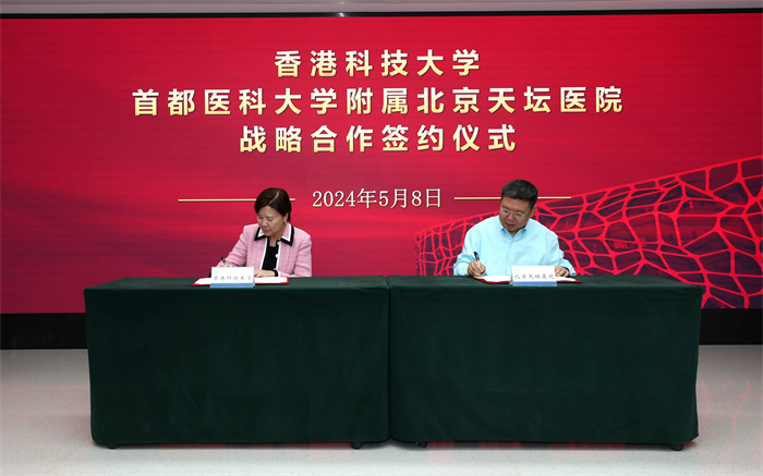 首都医科大学附属北京天坛医院(以下简称“北京天坛医院”)与香港科技大学(以下简称“科大”)5月8日在京签署战略合作备忘录,未来双方将在联合研究、成果转化应用、人才培养、医学教育、国际交流等领域开展交流和合作,共同培育兼具研究和临床能力的创新型医学人才,推动前沿科技与临床医学的结合,加快科研成果在临床上的转化应用。