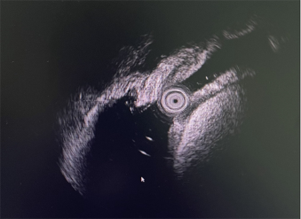 图1.EUS显示横结肠巨大病变呈黏膜下均匀高回声改变。