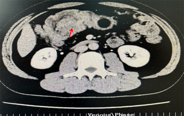 航空总医院消化病中心接诊后仔细询问查体,行便常规检查有便潜血免疫法阳性,通过电子肠镜检查时在横结肠处见一巨大粘膜下隆起凸入肠腔,表面有充血糜烂,肠腔近乎被肿物完全堵塞。超声内镜(EUS)显示横结肠黏膜下层巨大高回声肿物,脂肪瘤可能(图1)。CT检查提示横结肠巨大粘膜下肿物,约6.7cm×4.3cm,近似人体拳头大小,几乎占据整个肠腔(图2)。