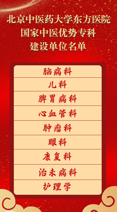 北京中医药大学东方医院脑病科、儿科、脾胃病科、心血管科、肿瘤科、眼科、康复科、治未病科、护理学共9个专科获得国家中医优势专科建设单位。