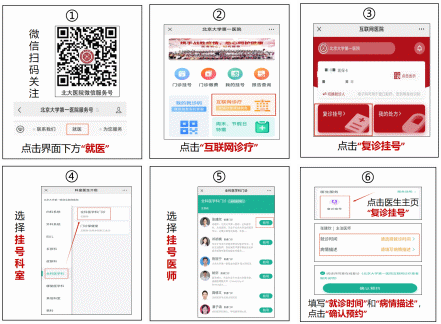 北大医院:您点开我们医院微信服务号,点击互联网诊疗,选择您要挂号的科室和大夫,详细描述您的病情,挂号等待医生接诊就行啦。