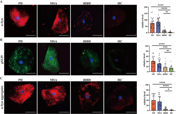 这项研究通过无创性获取口腔粘膜细胞样本,应用SAA技术检测口腔粘膜细胞来源α-突触核蛋白的“种子活性”。该研究发现,与健康对照组相比,帕金森病、多系统萎缩和孤立性快速眼动睡眠行为障碍患者的口腔粘膜细胞中α-突触核蛋白的“种子活性”显著增强。