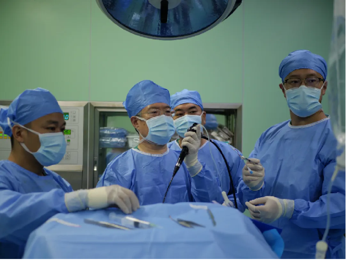神经外四科(内镜微创神经外科)主任肖庆以其独到的软性神经内镜技术破解脑出血难题。相比传统的被动清除血肿,软性神经内镜仅通过直径约1cm骨孔,直达病灶,明确出血点,探寻血肿与脑组织关系,在工作通道中对其止血、冲洗、钳取等操作,遇到急性梗阻性脑积水等突发状况,也可一并解决,最终可视下放置一根外引流管,不仅高效率清除血肿,还大大缩短了引流时间,降低感染风险,减轻经济压力。