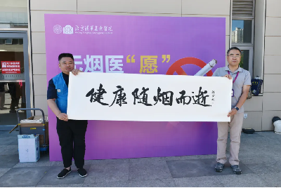 在北京清华长庚医院的门诊部入口外,医院设置了无烟医“愿”的宣传展板,并邀请患者、家属、院内同仁一同参与,支持无烟医院建设,大家纷纷在展板上签名、并喊出响亮的口号——“支持无烟医院建设”,形成了一股有力的声浪。