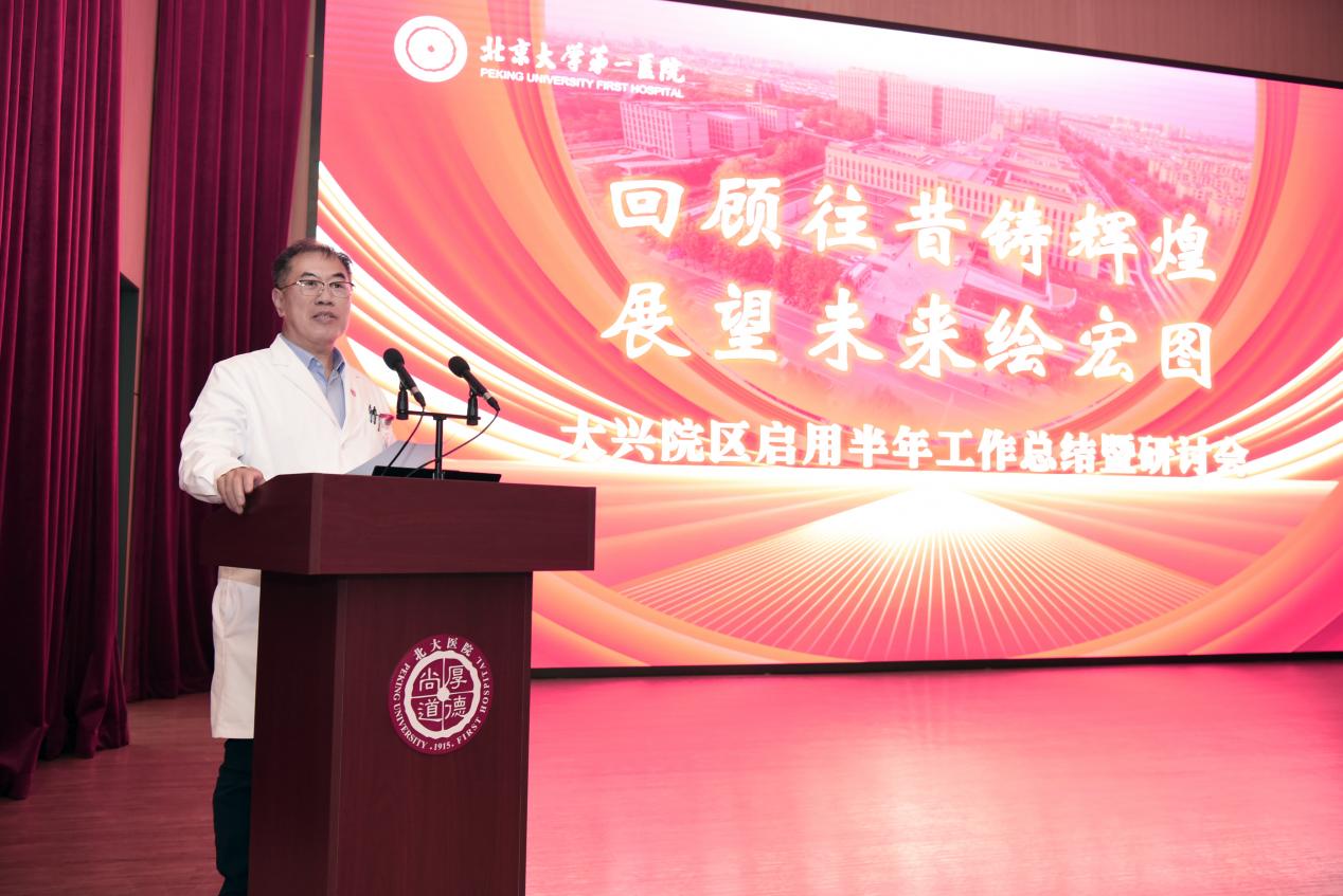 6月17日, 北京大学第一医院大兴院区启用半年工作总结暨研讨会在大兴院区报告厅召开。医院党委书记姜辉、院长杨尹默、副院长王鹏远、李航、张凯、总会计师李敬伟,大兴院区执行院长张崔建、副院长于楠、孙璐以及各临床医技科室主任、职能处室主任/处长、大兴院区常驻人员等150人围坐一堂,以“回顾往昔铸辉煌 展望未来绘宏图”为主题,总结经验、明确方向、鼓足士气,凝心聚力,共同推进医院高质量发展。本次会议由主题汇报、专题汇报与专题讨论三个环节构成,分别由张凯副院长、张崔建执行院长和于楠副院长主持。