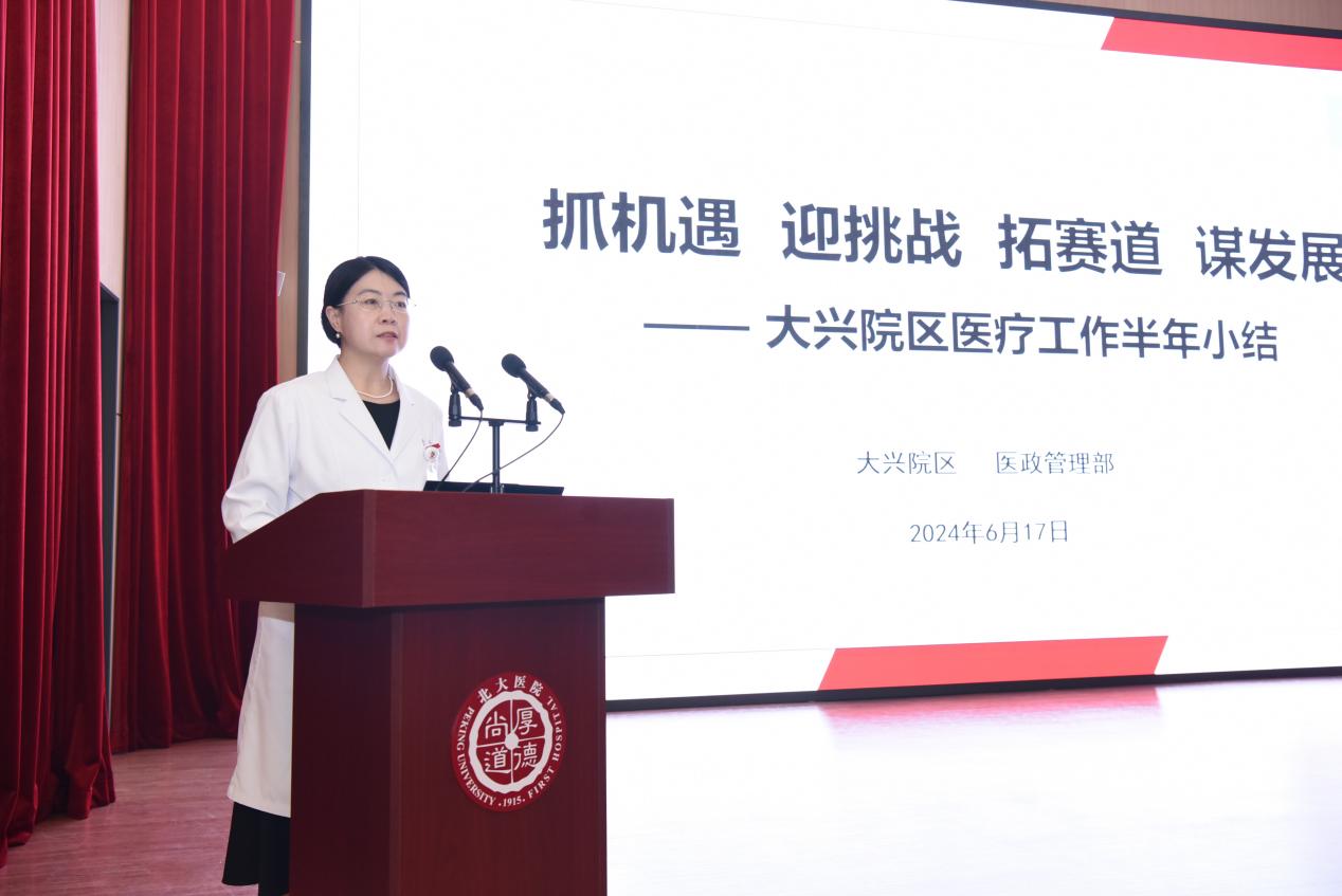 于楠以医疗数据为抓手,进行了“抓机遇、迎挑战、拓赛道、谋发展”的主题汇报。大兴院区启用180天,在全院上下的共同努力下,实现了医疗增量、提质增效,并迎来了医院优化结构、高质量发展的难得机遇。她介绍了大兴院区1-5月的医疗数据及发展瓶颈,提出在现有成绩的基础上,仍有提高空间,需要持续发力,进一步突破。在接下来的工作中,应双院区科学布局促增量,不放松底线思维提质量,信息化助力新发展,精益化提高新效能,全局化优化新结构 ,努力开拓大兴院区更加美好的明天。