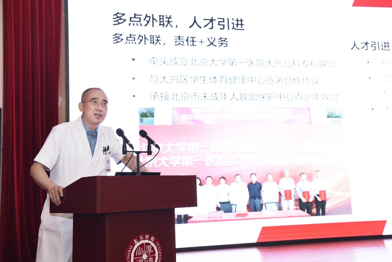 儿童医学中心主任姜玉武总结了中心半年的成绩,并针对儿内科、儿外科和儿童癫痫中心的CMI提升、单病种质量控制取得的改进效果进行汇报。姜主任强调,巩固儿童医学中心的发展,离不开强有力的科研基础,离不开创新型人才引进,离不开专科联盟的支持,期望通过大兴院区这个优秀平台能够持续巩固北大医院儿童医学中心在北京南城的强势地位,进而为北京市基层儿科及区域医疗发展提供范本。