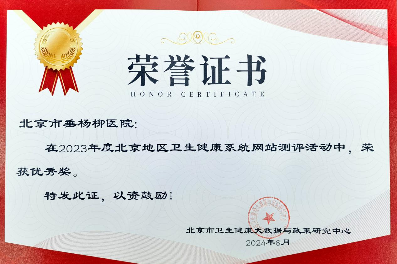 6月19日,在北京市卫生健康大数据与政策研究中心举办的2023年度北京地区卫生健康系统网站和移动应用测评工作总结暨部署动员会上,对2023年度北京地区卫生健康系统网站和移动应用测评获奖单位进行了表彰。北京市垂杨柳医院官方网站综合得分95.8分,较2022年度排名提升40名次,从北京市卫生系统116家参评网站中脱颖而出,取得第十名的成绩,荣获“优秀奖”。