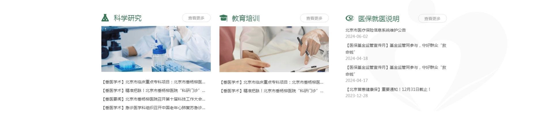 网站底部是医院科研教学相关文章展示,点击可跳转详情页;医保知识板块主要是想百姓科普最新的医保政策和知识。