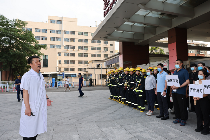 2024年6月21日,首都医科大学附属北京朝阳医院(以下简称朝阳医院)本部院区与朝阳区消防支队呼家楼消防救援站联合组织开展了一场消防应急疏散演练。北京市朝阳区建国门消防支队大队长杨洋、呼家楼消防站站长蔡亚辉、消防站指导员杨洪春,朝阳医院党委常委、副院长王明刚参加演练。