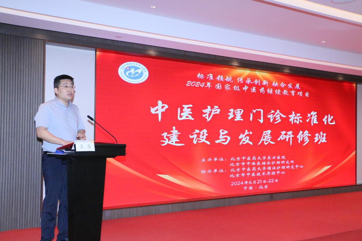 六月京城景,柳动好风生。2024年6月21日—22日,国家级中医药继续教育项目“中医护理门诊标准化建设与发展研修班”在北京广西大厦成功召开。本次研修班由北京中医药大学东方医院、北京市中西医结合护理研究所主办,北京中医药大学循证护理研究中心、北京市中医技术质控中心协办,会议主题为“标准领航·传承创新·融合发展”。中华中医药学会副会长兼秘书长王国辰(线上)、中华中医药学会标准化办公室主任苏祥飞、北京中医药大学东方医院党委副书记郭蓉娟、北京中医药大学东直门医院厦门医院院长裴晓华、北京中医药大学东方医院护理部主任唐玲、中国中医药报记者高尚等出席会议,来自全国各省市线上线下300余位护理同仁参加了本次会议。北京中医药大学东方医院科研处处长王乐主持开幕式。