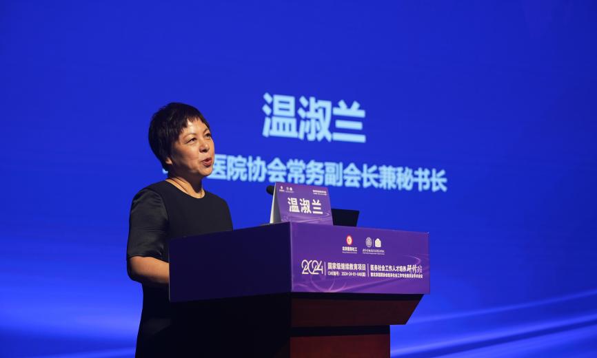 北京医院协会副会长兼秘书长温淑兰向莅临本次研修班的专家致以由衷的感谢、并向与会学员表示热烈的欢迎。她在致辞中提到,自2021年换届以来,北京清华长庚医院担任北京医院协会医务社会工作专委会主委单位,在医务社工行业建设引领方面发挥重要作用。希望与会各位通过本次议题丰富、内容多元的行业大会收获价值并转化实践,为医务社会工作注入新的活力动能。