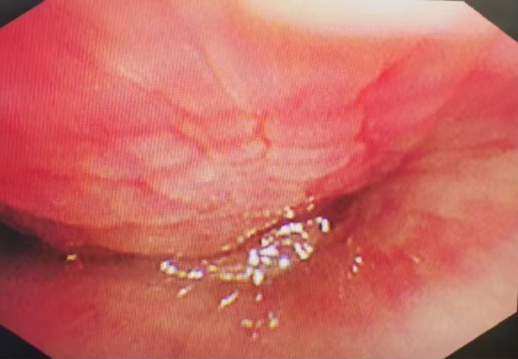 【病例报道】患儿男性,12岁。9月前因脊髓动静脉畸形行手术治疗,术后气管插管,数天后因肌无力行气管切开。后出现声门下塌陷狭窄(图1),2024.4月于我科行儿科MontgomeryT管置入术(32009R),术后每月规律随访。2024.6月,患儿行术后第2次随访时,在T管侧支和下支拐角处发现一球形痰栓样物(图2),予吸引清理,未能清除,后尝试活检钳钳夹,仍不能清除,后晃动T管侧支发现真实情况为T管侧支破裂,进而气管黏膜暴露,局部水肿隆起。为避免T管侧支破裂进一步加重,导致侧支断裂,我们对T管进行了更换。但考虑到T管侧支已破裂,且患儿气切窦口较紧,在拔出T管过程中,有可能导致T管侧支完全断裂,造成T管腔内部分移位阻塞气道造成窒息风险,因此我们术前准备了儿科硬镜(7.5号),儿童气切套管(6.5号),儿科气管插管(5.5号及6号)以及紧急情况下的通气策略。T管取出过程较为顺利,未发生侧支断裂的情况,随后我们重新置入了新的儿童T管。