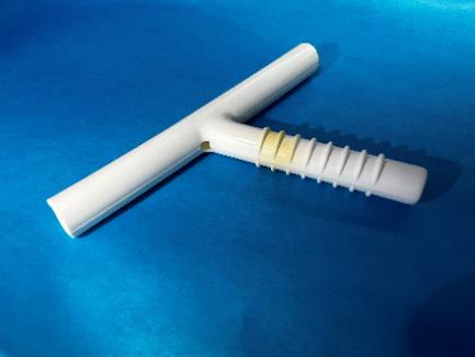 取出的T管显示在T管侧支与下支交界拐角处,可见大小约3×3mm的破孔(图3+视频)。与患者家属交流,诉在护理过程中,因患儿咳痰力弱,经常用力上抬及下压T管侧支,帮助患儿排痰及方便吸痰操作,考虑反复上抬及下压侧支产生的剪切力,是造成T管侧支破裂的可能原因。
