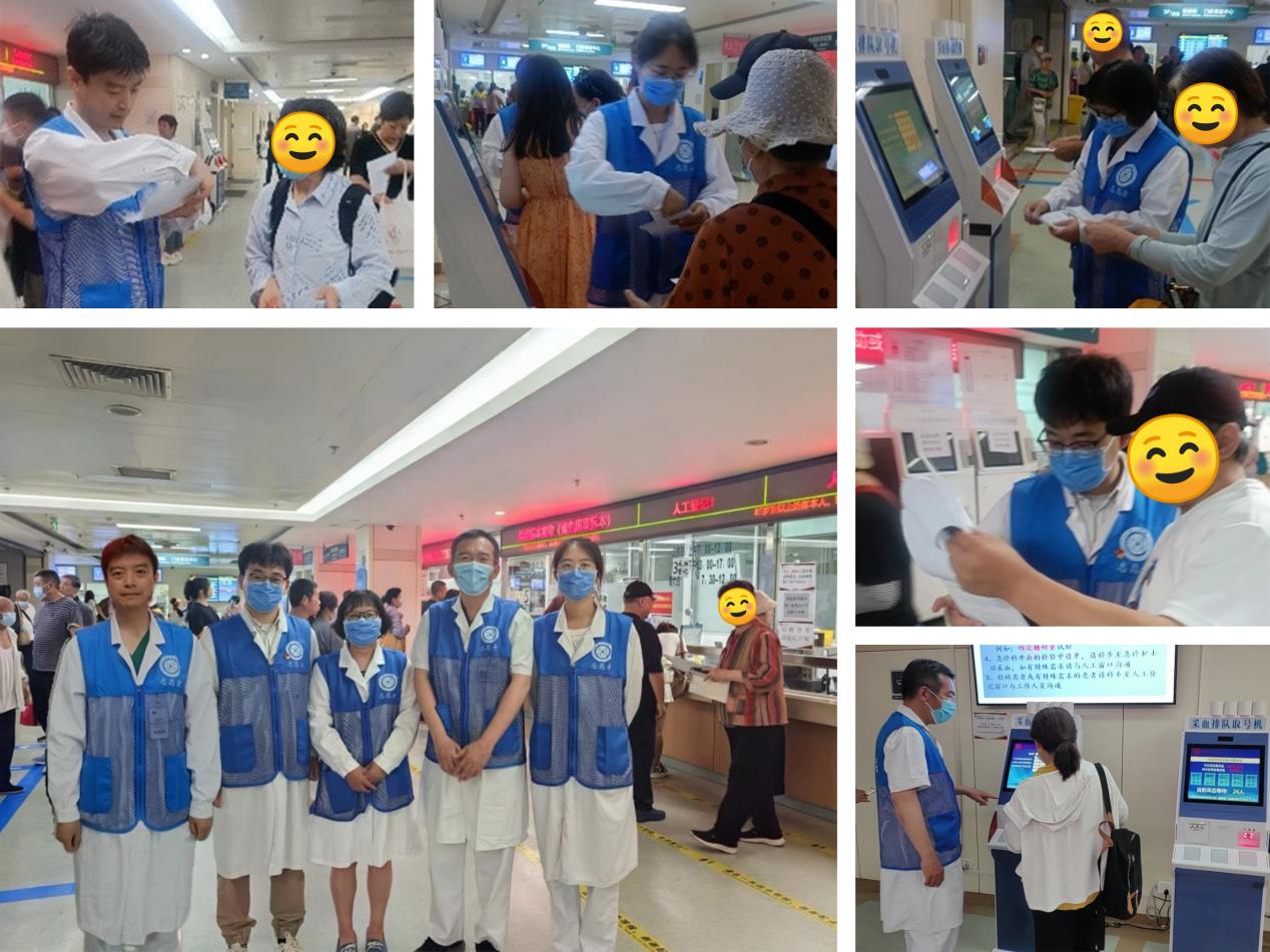 第一党小组与第三党小组的党员志愿者身穿白大衣或蓝马甲,在门诊三层采血中心区域为患者提供咨询帮助服务。他们耐心解答患者关于采血、取报告、自助机使用、挂号查询等方面的疑问,积极协助患者解决就诊过程中遇到的小问题。针对外地患者和老年人群,党员们更是倾注了加倍的耐心和关怀,确保他们能够在北大医院得到及时、有效、温馨的医疗服务。服务期间,党员们就优化患者体验、提升服务质量等向科室提出了合理化建议。