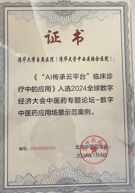 近日,北京市人民政府、国家互联网信息办公室主办的2024全球数字经济大会顺利召开。清华大学玉泉医院(清华大学中西医结合医院)内分泌科冯兴中教授团队申报项目《“AI传承云平台”临床诊疗中的应用》成功入选2024全球数字经济大会·中医药专题论坛-数字中医药应用场景示范案例。