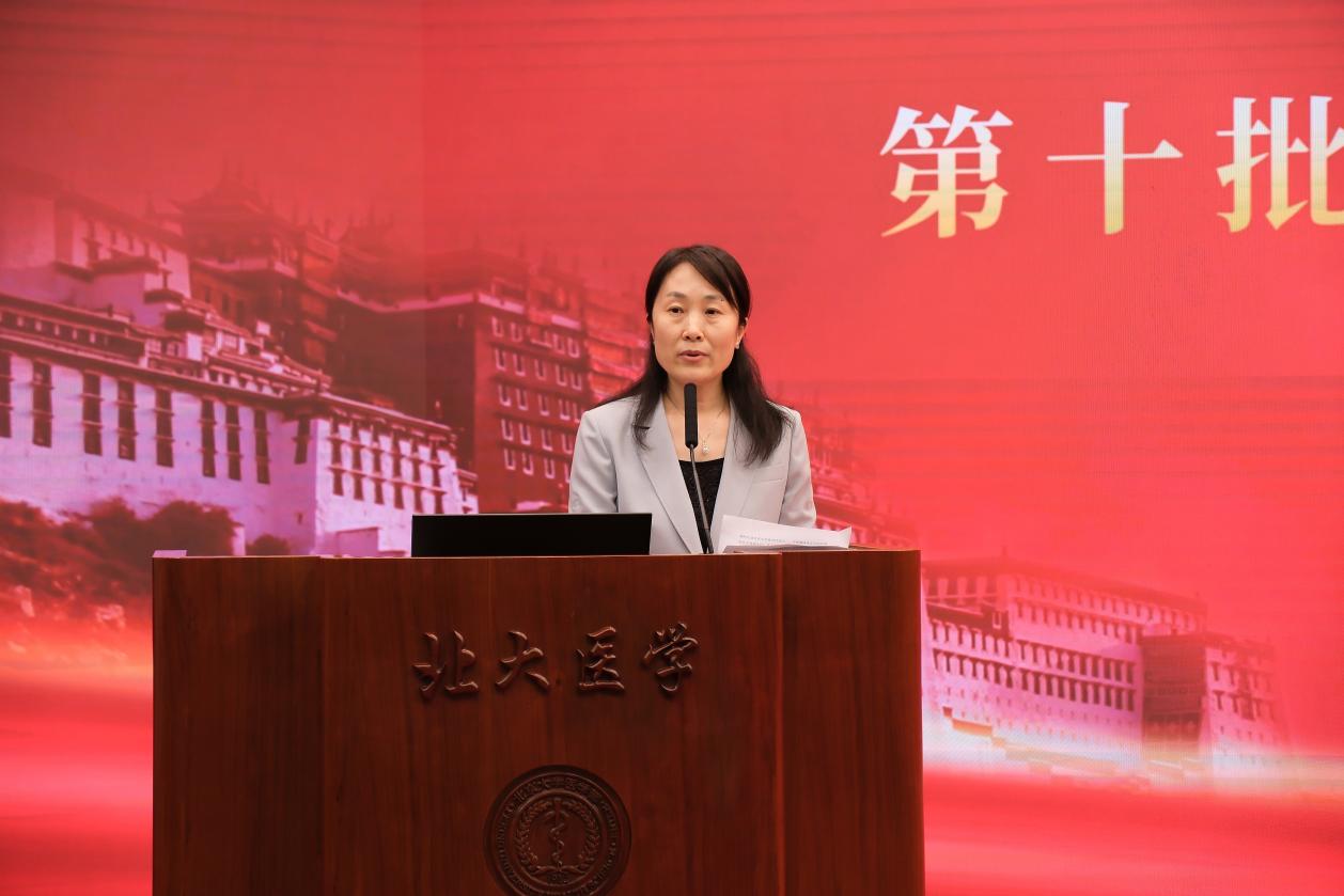儿童医学中心副主任侯新琳作为“老医疗队员”代表发言。她表示,作为第二批“组团式”援藏医疗队员、儿科第一批医疗队员,感到无比的光荣,这是她一生中最宝贵的财富。九年来,北大医学派出了百余位医疗专家持续接力奔赴西藏,始终坚持“人民至上、生命至上”的理念,把改善民生、服务人民作为工作的出发点和落脚点,在医、教、研、管等方面都取得了出色的成绩。希望第十批队员始终坚定不移地听党话、感党恩、跟党走,尽己所能,有为而归,发扬厚道的北医精神,继续谱写出雪域高原医疗发展的新篇章。