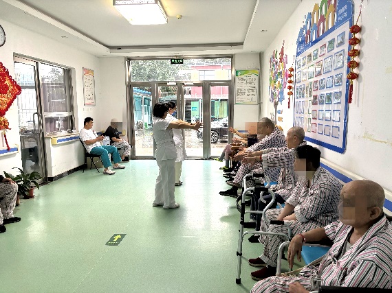 随后,护士带领老年患者进行了较为轻柔、强度较小的运动手指操。手指操可以增强血液循环,改善脑部的血液供应,提高代谢,同时不会给身体带来过大的负担。