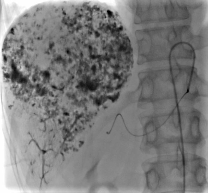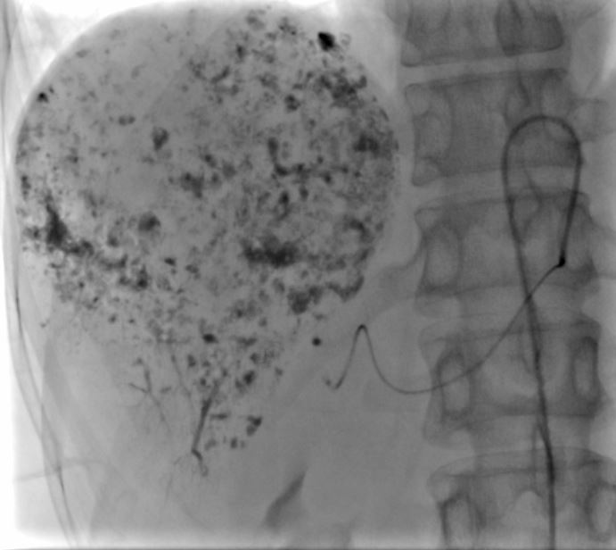 近日,潞河医院介入疼痛科为一名巨大肝血管瘤女性患者成功实施了介入栓塞治疗。患者梁女士今年49岁,体检时发现肝右叶血管瘤,最大径约9.6cm,且位于肝脏边缘,虽然破裂的几率较小,但一旦自发或外伤性破裂可能会给患者带来致命后果。梁女士入院后,介入疼痛科主任韩洋带领团队认真评估了术前影像学检查,并完善各项检验,排除治疗禁忌后,讨论制定了治疗方案。在与梁女士及家属充分沟通后,介入团队为其成功实施了微创介入栓塞治疗。术中腹腔干及肝动脉造影可见肝右叶巨大肿瘤染色,随着栓塞治疗的持续,可见该血管瘤内药物逐渐沉积,治疗完毕后再次造影显示原肿瘤供血动脉已封堵。手术成功完成,达到了治疗目的。术后,梁女士没有出现任何不良反应,现已顺利出院。