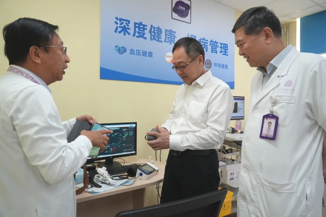 全科与健康医学部部长、天通苑北社区卫生服务中心副主任王仲(左一)向于学军(中)介绍智能化筛查设备
