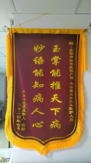 时间过得真快,转眼小刘和她的孩子早早已经顺利出院并安全度过了产后42天。产后复查时,小刘一家把一面鲜红的锦旗送给了佑安产科团队,表达全家人对北京佑安医院朱云霞主任和全体医护人员的感激之情。