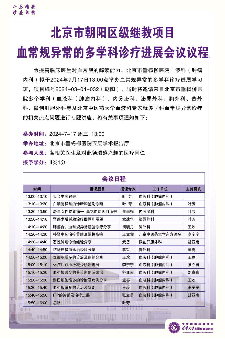 【垂医学术】清华大学附属垂杨柳医院血液科(肿瘤内科)成功举办血常规异常的多学科诊疗进展学习班