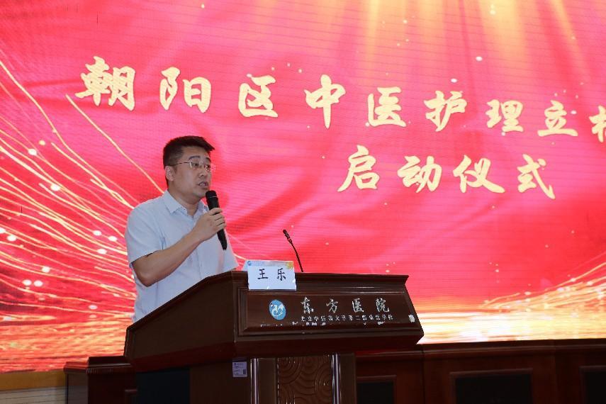 北京中医药大学东方医院副院长王乐致辞,他指出,“朝阳区中医护理立标工程”培训是贯彻落实《北京市朝阳区实施中医药传承创新发展示范试点项目工作方案》的具体行动,是提升护理队伍专业服务能力的有效实践。东方医院护理学作为国家中医药管理局“十二五”中医护理学重点专科、国家中医优势专科建设单位(护理学)等,已形成了三位一体独具优势的中医护理人才培养模式,作为“朝阳区中医护理立标工程”实践基地,东方医院将持续培养输送具有理论扎实、技能出色、富有人文精神的高素质中医护理人才,希望学员在学习中,理论联系实际,深刻理解中医护理内涵和精髓,相互交流借鉴,为中医护理事业的发展贡献力量。