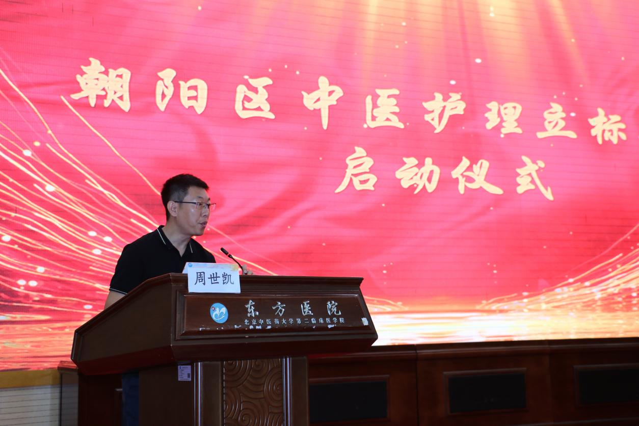 朝阳区卫生健康委员会副主任周世凯致辞,他代表朝阳区卫健委对东方医院承办此次培训表示感谢,并指出中医药是中华文明的瑰宝,中医护理不仅承载着中医文化的丰厚底蕴,而且在现代医疗领域展现出独特魅力和价值。目前,群众对中医药的接受度越来越高,中医已越来越多融入人们的日常生活,其独特的护理方案和护理技术在疾病防治及养生康复方面发挥着重要作用,这不仅是弘扬中医药文化的重要机遇,更是中医发展历程的一次重大挑战。这次培训不仅仅是个人能力的提升,而是整个朝阳区中医护理服务能力的提高,希望通过此次培训,强化中医理论知识,精湛中医护理技术,更好地服务于患者,提高患者满意度。