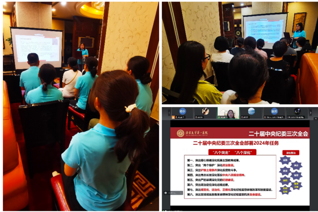 北京大学第一医院甲状腺乳腺外科党支部书记兼纪检委员徐玲进行了《中国共产党纪律处分条例》学习的党课讲授,系统介绍了二十届中央纪委三次全会上的2024重点任务,强调了“八个突出”和“八个深化”,要求全体支部党员弘扬廉洁文化、强化纪律意识、加强自我约束,号召全体党员“受警醒、明底线、知敬畏”。