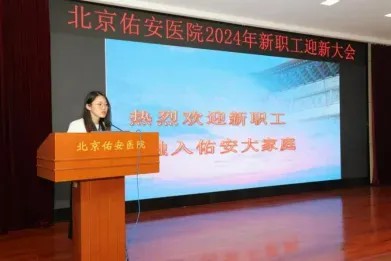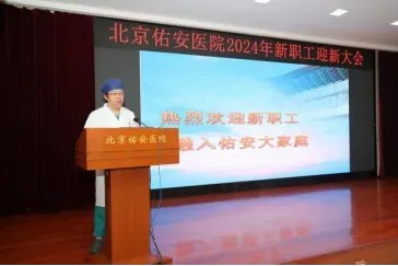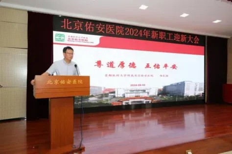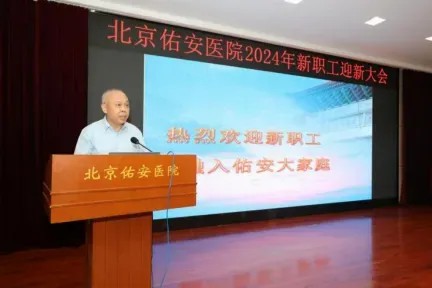 马迎民院长为大会致辞,首先对2024年新职工的加入表示热烈欢迎,随后以深邃的视野和满腔的热情向新职工介绍了医院的优势学科与定位,阐述了医院精神与文化内核并鼓励新职工秉持初心使命,在佑安平台早日绽放光芒。