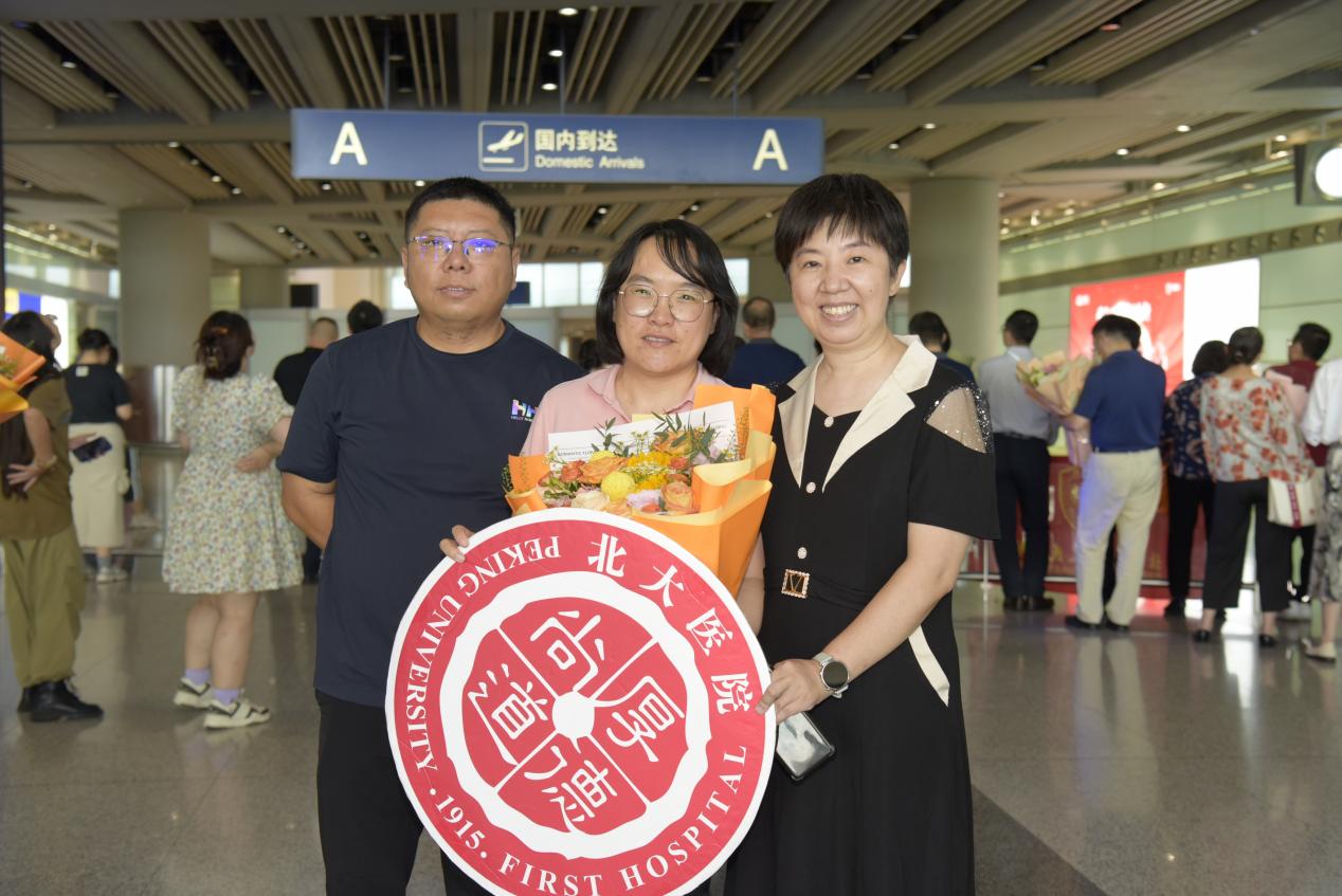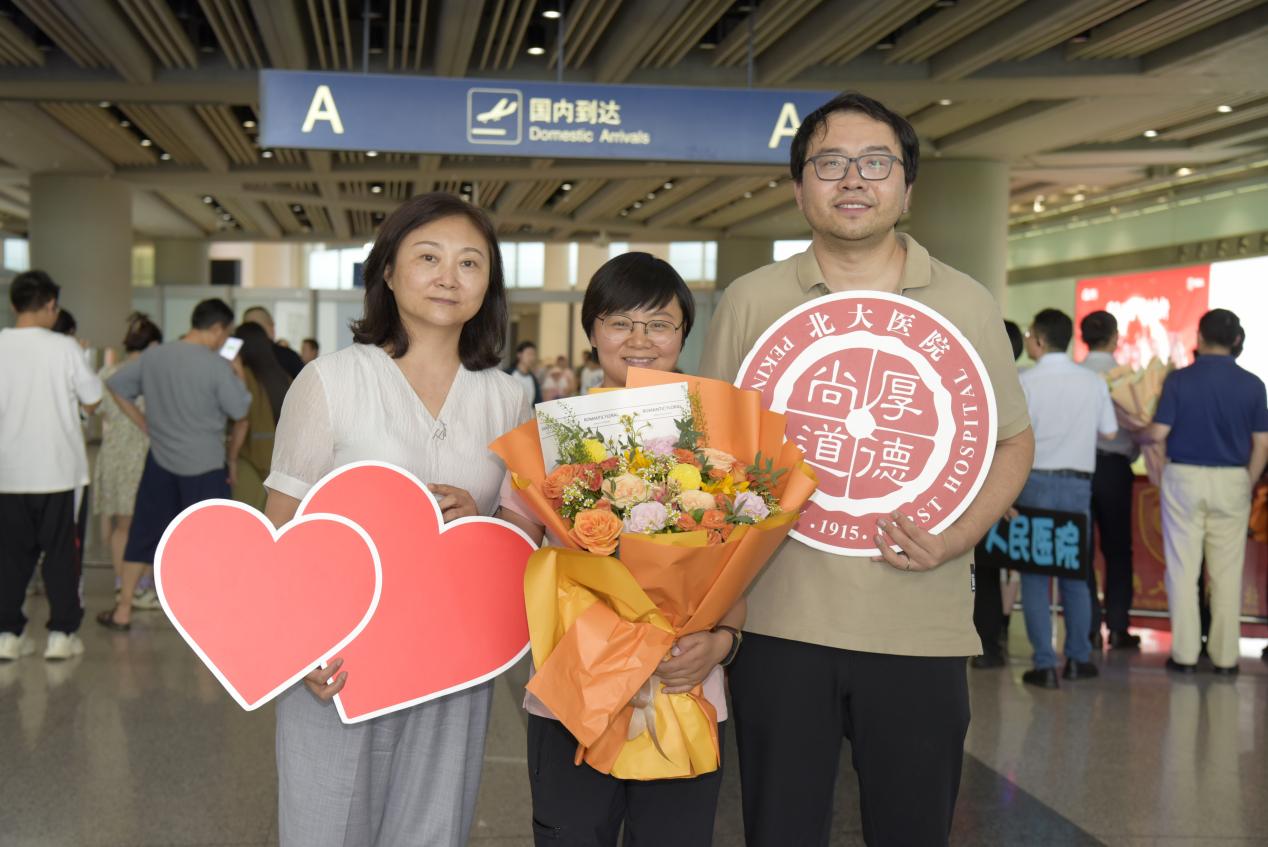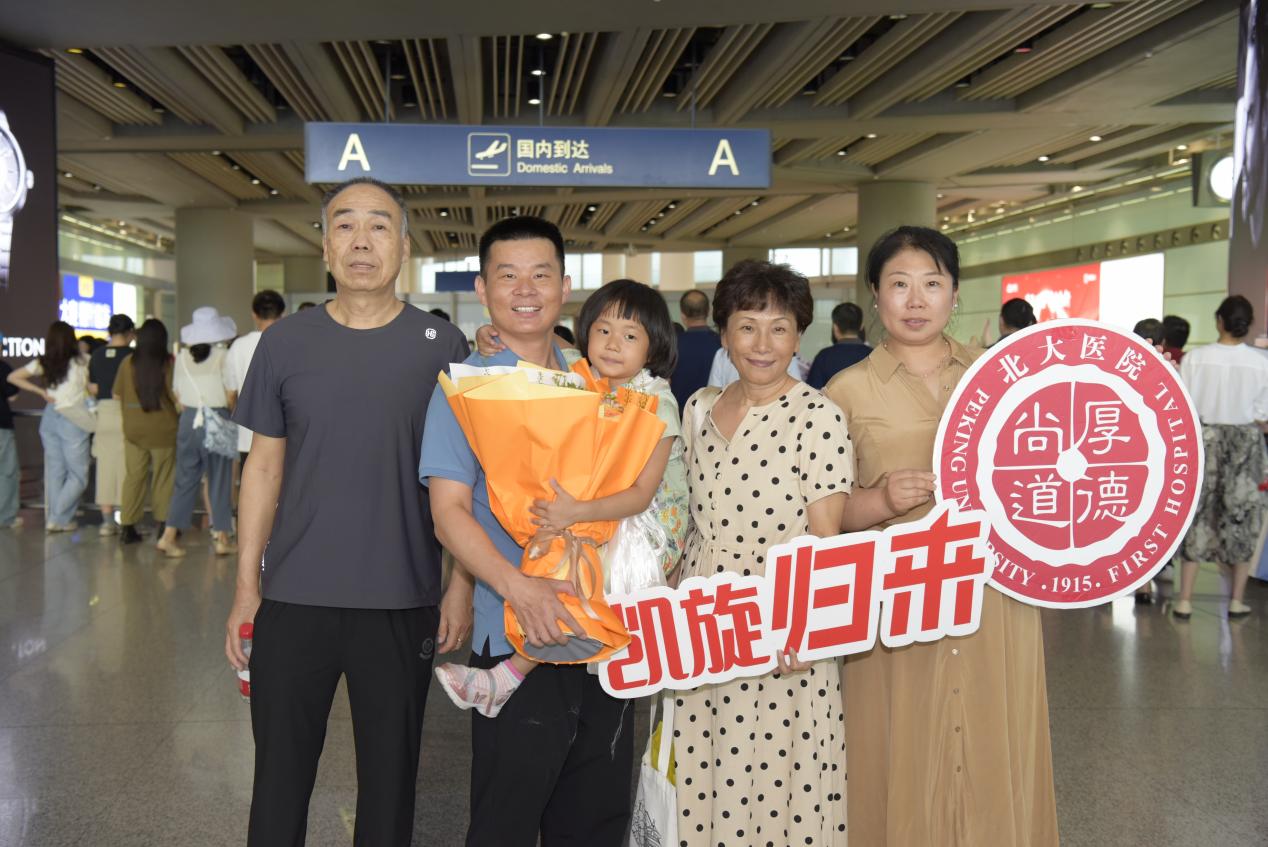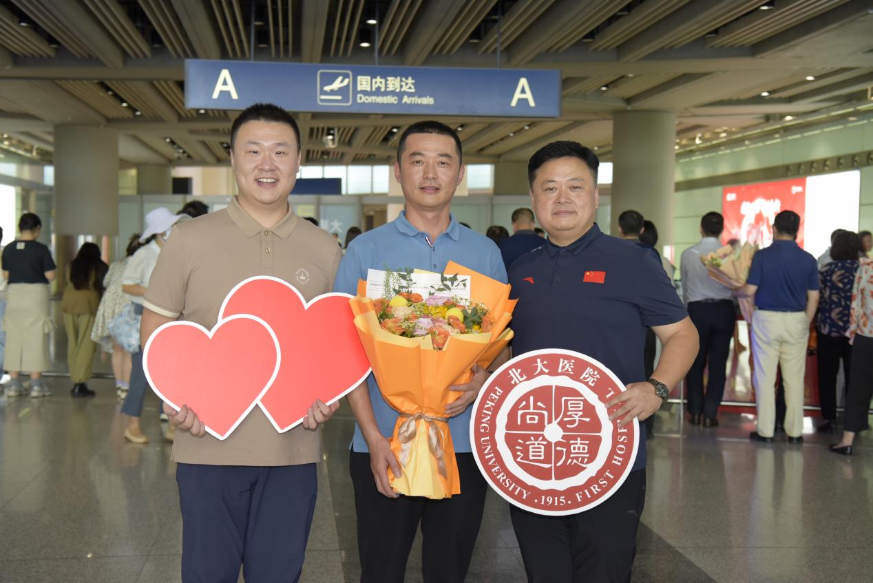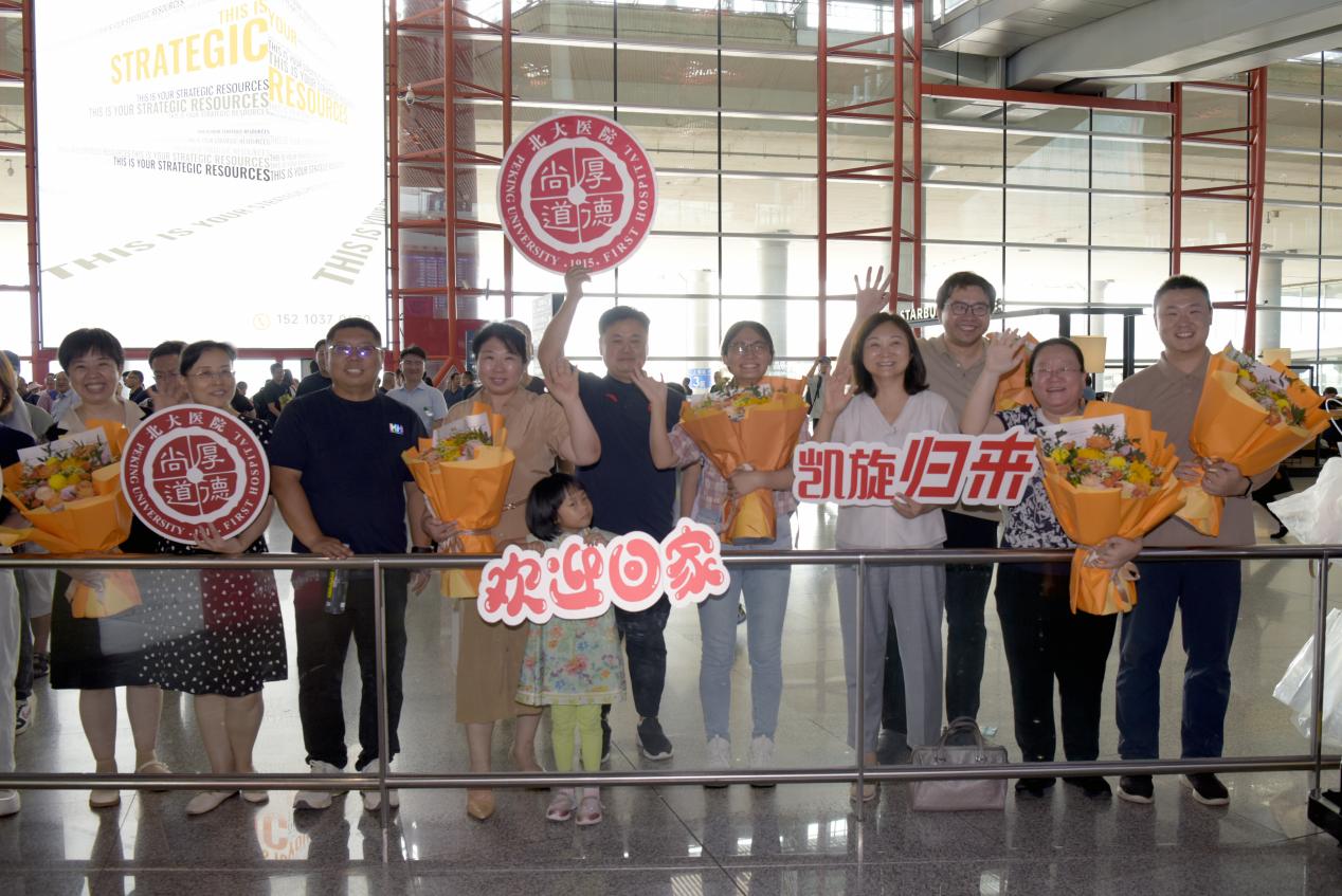 当6名队员的身影出现在眼前时,医院领导、同事纷纷上前热烈欢迎,送上鲜花和掌声表达了对他们的敬意:“欢迎回家!你们用实际行动诠释了 “厚德尚道”精神,诠释了医者仁心、责任担当!你们是北大医院的骄傲!”