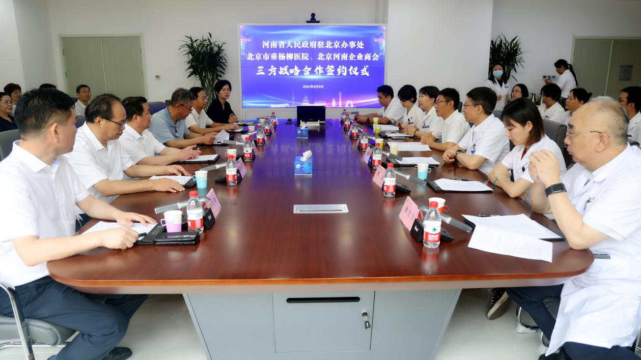 8月9日,河南省人民政府驻北京办事处、北京市垂杨柳医院与北京河南企业商会在北京市垂杨柳医院行政五层5号会议室举行战略合作协议签约仪式。河南省人民政府副秘书长、河南省人民政府驻北京办事处党组书记、主任何伟,河南省驻京办党组成员、副主任任立新,河南省驻京办二级巡视员、社会工作服务处处长常顺楼,北京市朝阳区卫生健康委副主任周世凯,北京市垂杨柳医院党委书记、院长张新庆,北京河南企业商会执行会长兼秘书长岳皞,北京河南企业商会执行会长周胜利,北京河南大厦总经理任现红等出席会议并见证了此次战略合作协议的签约。北京市垂杨柳医院副院长黄春雷主持会议。
