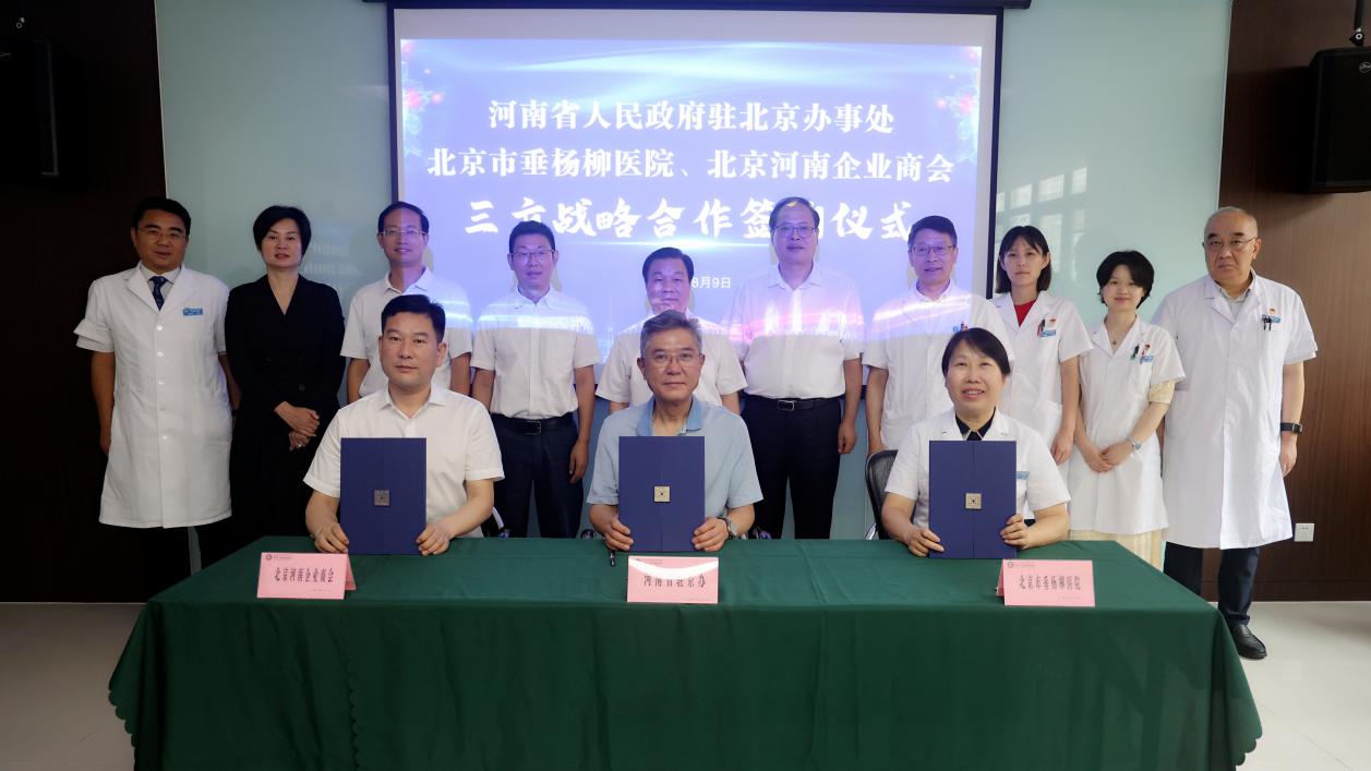 会议最后,河南省驻京办党组成员、副主任任立新,北京市垂杨柳医院党委副书记、副院长赵伟,北京河南企业商会执行会长周胜利分别代表三方签署战略合作协议。与会嘉宾共同见证签约并合影留念。