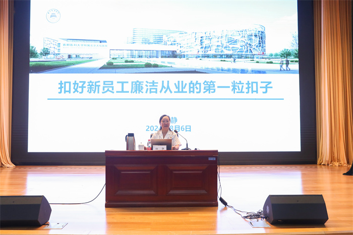 培训过程中,任静以“扣好新员工廉洁从业的第一粒扣子”为题,讲解如何以高质量党建引领公立医院高质量发展、以忠诚干净担当的实际行动立足岗位,提醒大家要廉洁从业,做纯粹医者。徐燕玲为大家介绍工会概况和职能,展示了工会的各项工作、各类活动的精彩瞬间,让各位新职工都感受到了工会给予的温暖力量。
