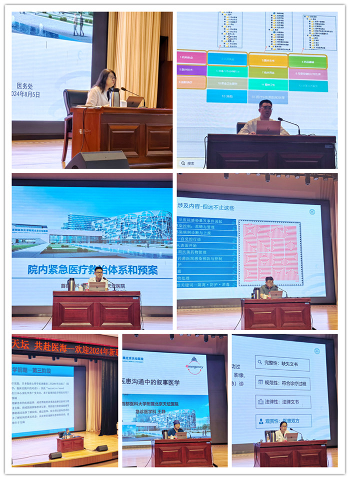 医管中心医学人文讲师王静老师从心理及医学人文角度,为新职工讲解了医患沟通中的叙事医学,通过一个个案例让各位新职工身临其境,学会与患者共同决策、换位思考。医务处从依法执业、医德医风等方面对新职工进行了培训。医保办、安全稳定处、科技处、伦理办、督导办、人力资源处、团委、教育处、信息管理与数据中心等职能部门为新职工进行了专题培训,内容涵盖医院文化、规章制度、政策解读、经验交流等多个方面,并对新职工入职后的常见问题进行了答疑解惑。感染管理处、疾病预防控制处、输血科、病理科为新职工介绍了院内感染、疾病防控、输血安全等相关专业知识。