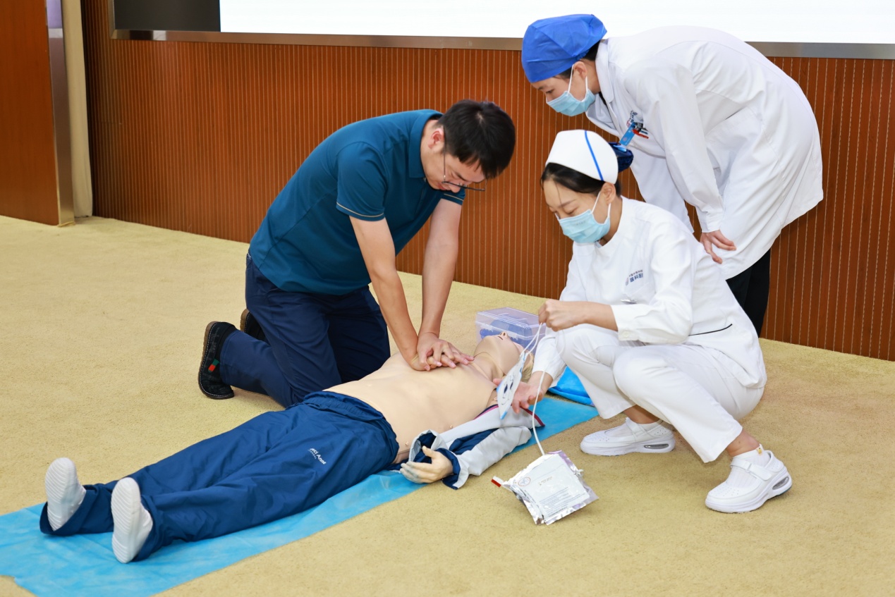 急诊科主任张智玺进行培训,内容涵盖了心肺复苏术(CPR)、AED(自动体外除颤器)使用、创伤止血包扎以及异物梗阻急救(海姆立克急救法)的紧急处理等多个方面。急诊科医护人员做实操演练,通过理论讲解与实操演练相结合的方式,确保每位参加人员都能熟练掌握急救技能。培训现场气氛活跃,参加人员积极参与,纷纷表示受益匪浅。
