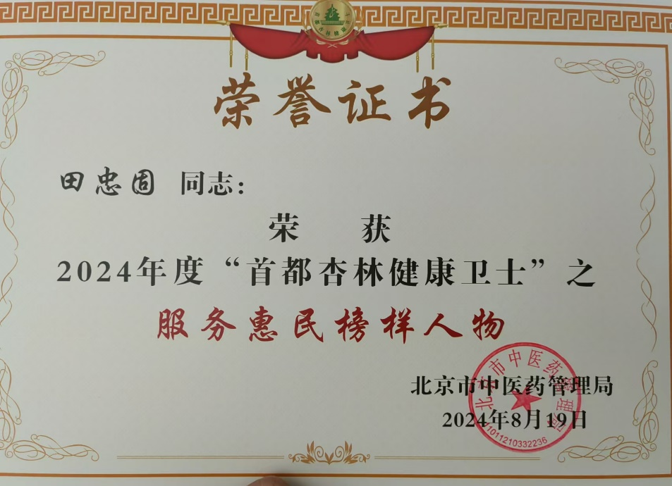 平谷中医院田忠固主任医师荣获2024年度“首都杏林健康卫士”之服务惠民榜样人物称号