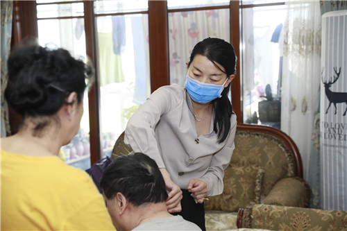 考虑到杨杏春脑部受损后常有躁动,所以针灸选穴以头针为主,留针行针的同时配合下肢的康复锻炼。消毒、针灸、搀扶下站立行走……一整套流程下来,通常接近一小时。孟宪芝端来茶水饮料,甚至留郑慧敏在家吃饭,但郑慧敏都婉言谢绝了,她知道孟阿姨照顾杨杏春工作量已然很大,不忍心再添麻烦。每次义诊结束,郑慧敏还会嘱咐清楚近期注意事项,才收拾好医疗包,踏上回家的路。