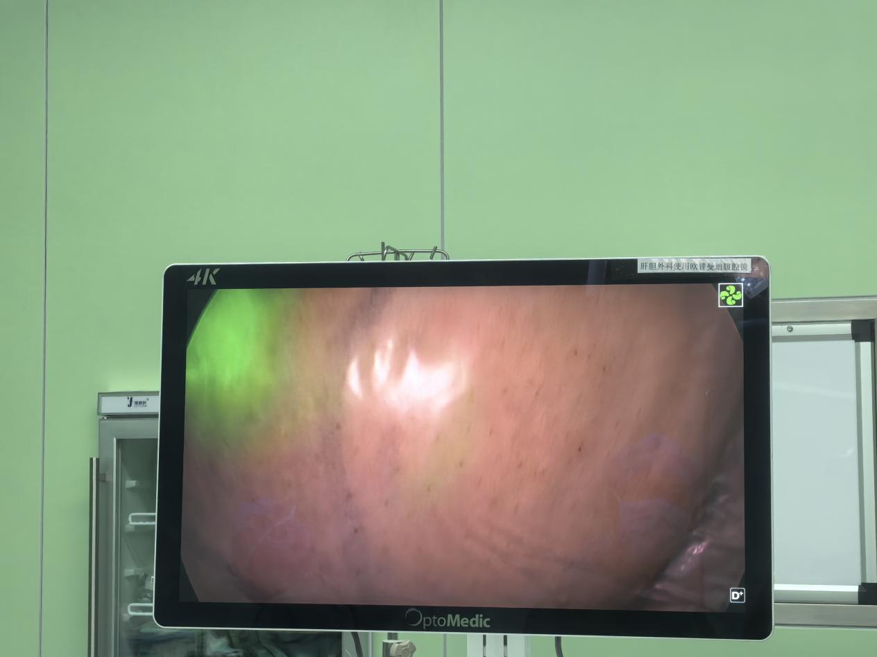 在亚甲蓝染料标记后再次进行吲哚菁绿标记,腹腔镜荧光模式下可见被标记的淋巴管