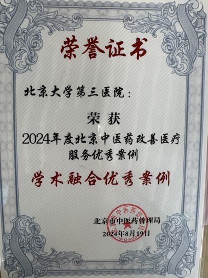 在“首都杏林健康卫士”评选活动中,北京大学第三医院中医科李东、辛喜艳、李云虎、张浩琳医生分别荣获“传承育人榜样人物”、“学术融合榜样人物”、“服务惠民榜样人物”和“国际传播榜样人物”称号。在改善医疗服务优秀案例评选活动中,北京大学第三医院“中西医协同妇科生殖案例”被评为学术融合优秀案例。