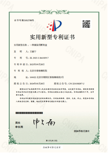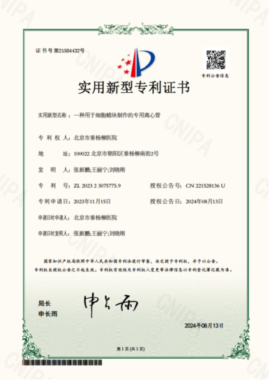 近日,北京市垂杨柳医院病理科两项实用新型专利《一种细胞蜡块制作的专用离心管》《一种滴染用孵育盒》正式通过国家知识产权局批准,获得专利证书。